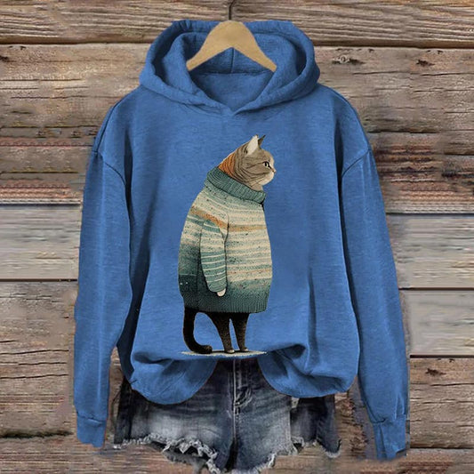 Women's Winter Cat Print Casual Hooded Sweatshirt