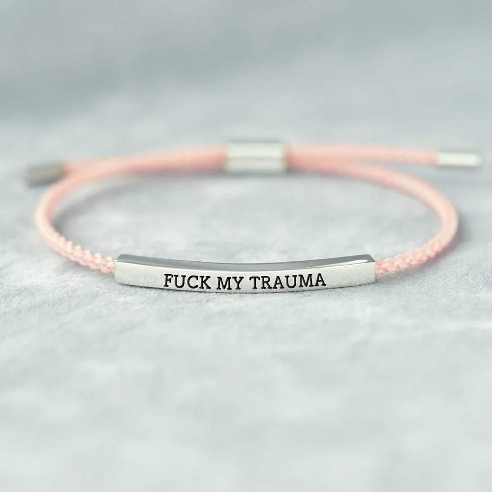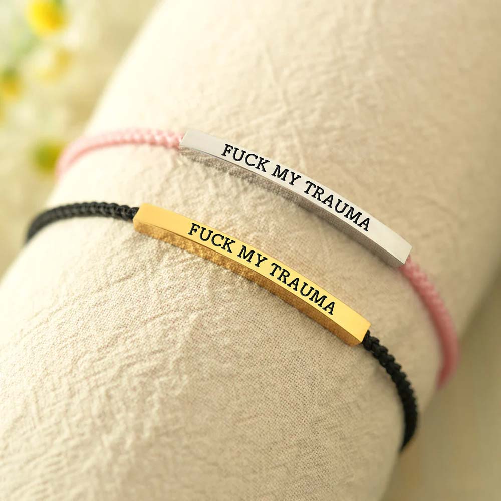 Make a statement with our "Fuck My Trauma" bracelet—a bold reminder of your strength and resilience. Featuring a sleek metal bar engraved with this unapologetic message, this piece is designed for those who refuse to let their past define them.
