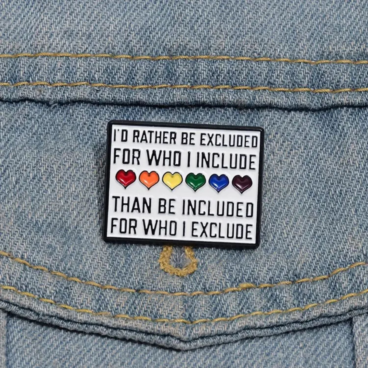 "I'd Rather Be Excluded for Who I Include" LGBTQ Pride enamel pin 🌈✨ – a bold statement of love and inclusion.