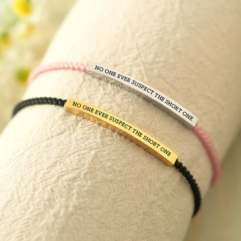 Stand tall in your own way with the "No One Ever Suspects The Short One" bracelet. Engraved on a sleek metal bar, this bracelet is a playful yet empowering reminder that sometimes, being underestimated is your greatest strength.