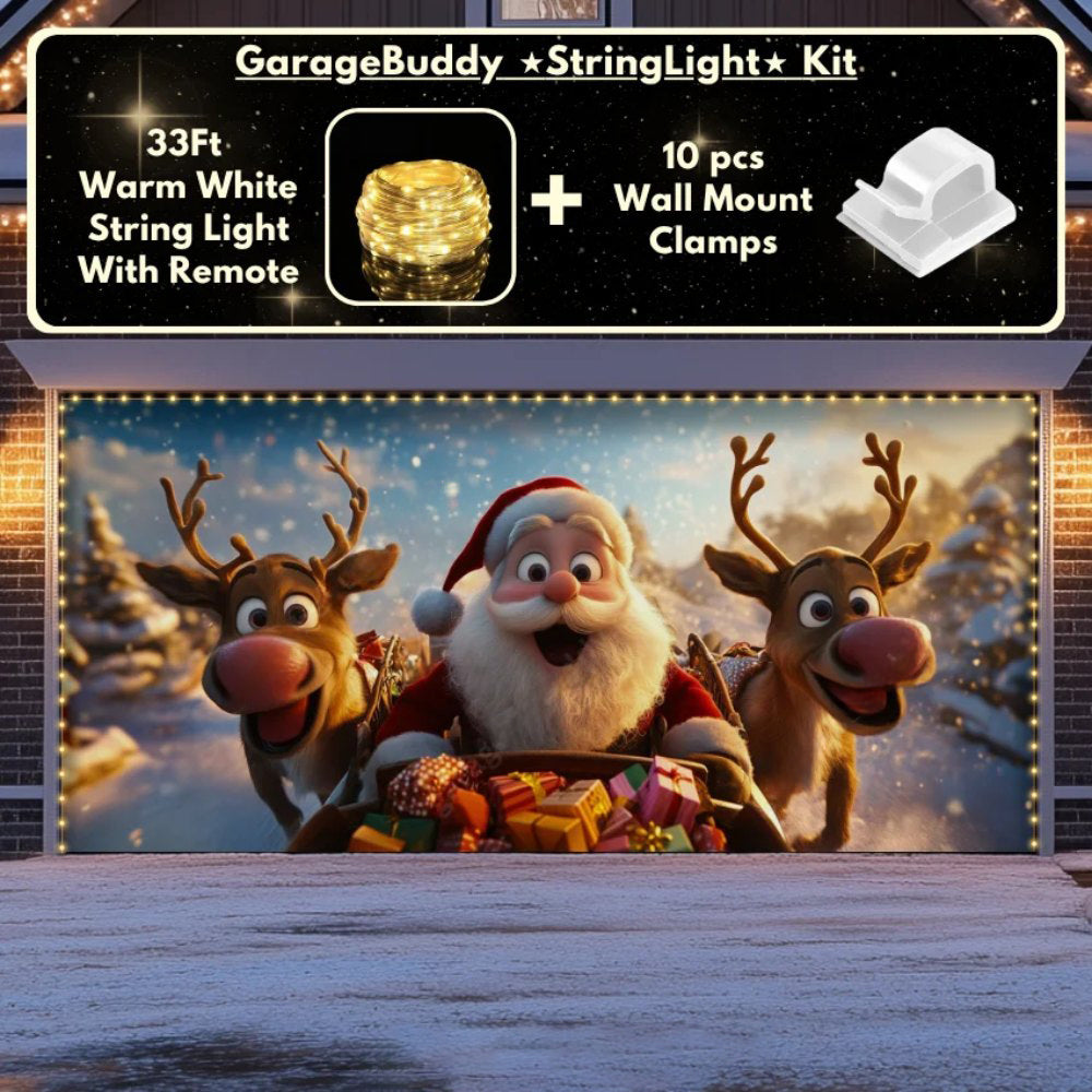 Now you can elevate your holiday display with our string light kit-available at 50% off! Pair your Christmas Garage Door Cover with glowing outdoor Christmas lights and turn your garage into a true showstopper. The kit includes 1x 33 ft warm white string light, a remote control, and 10x sticky wall mount clamps.