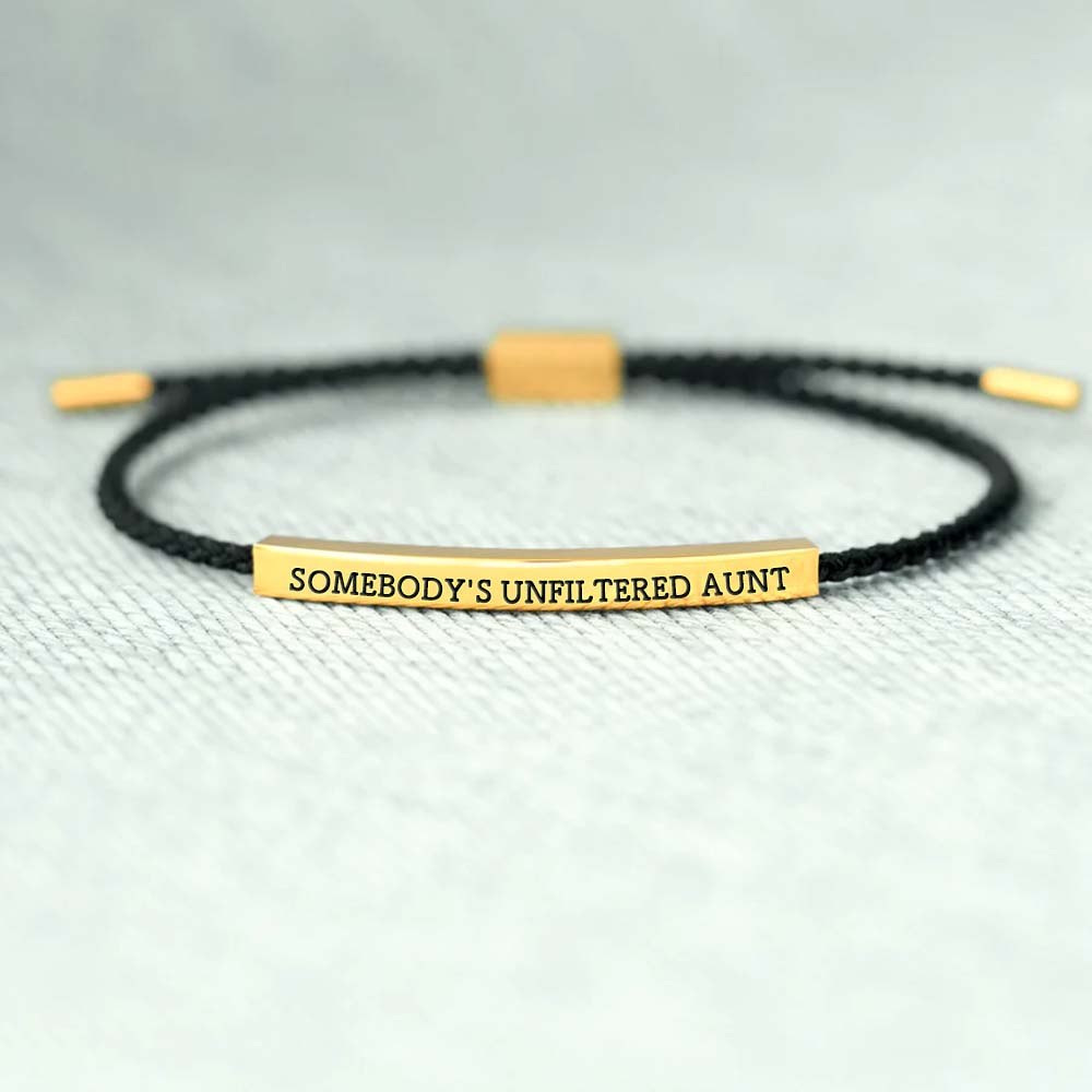 Celebrate the no-filter, tell-it-like-it-is energy with the "Somebody's Unfiltered Aunt" tube bracelet. Featuring a sleek metal bar engraved with this cheeky phrase, this accessory is made for the aunt who’s always authentic, a little wild, and endlessly fun.