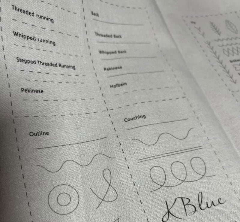 This linen fabric has each embroidery stitch name in English, so you can start stitching under the stitch name.