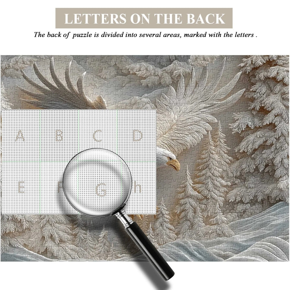 Experience the dramatic elegance of the wild with “The Carved Eagle Jigsaw Puzzle 1000 Pieces”. A powerful bald eagle soars with wings fully extended, set against a textured, snow‑covered pine forest that evokes a carved wood relief. The monochromatic palette of whites, greys and subtle brown‑tones lends an atmospheric, serene backdrop while the dynamic pose of the eagle conveys strength, freedom and vision.